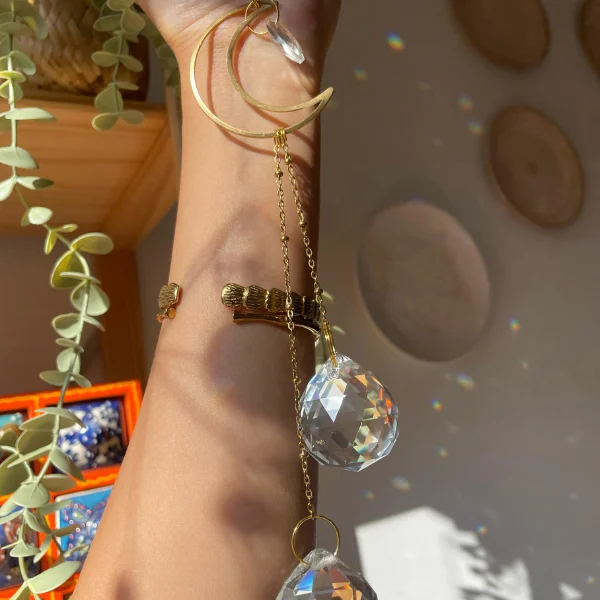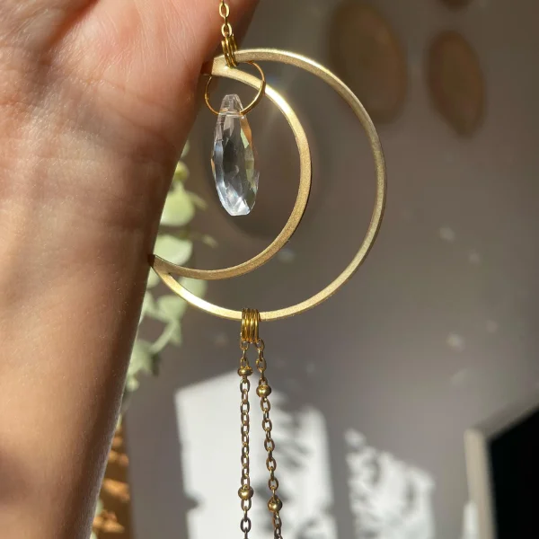 En su centro, una luna dorada de 5 cm abraza un cristal que refleja los matices del sol. Dos cristales K9 facetados de 3 cm cuelgan en cascada, proyectando arcoíris cuando la luz los atraviesa.