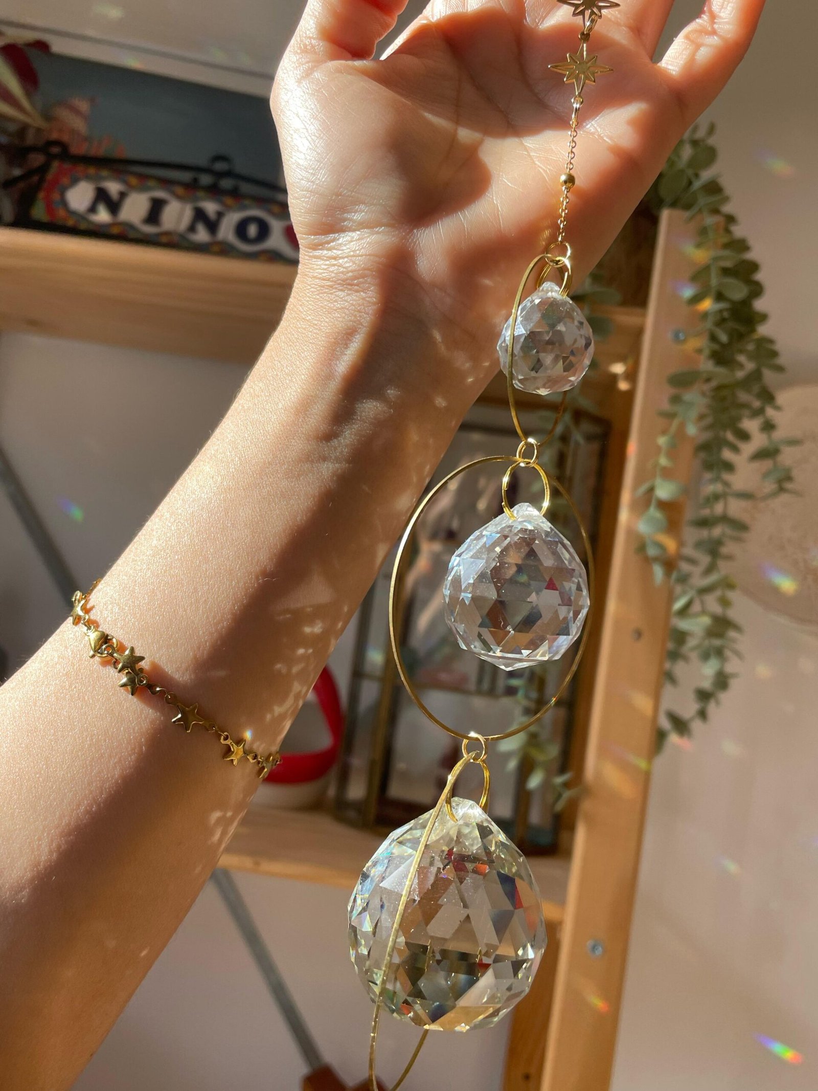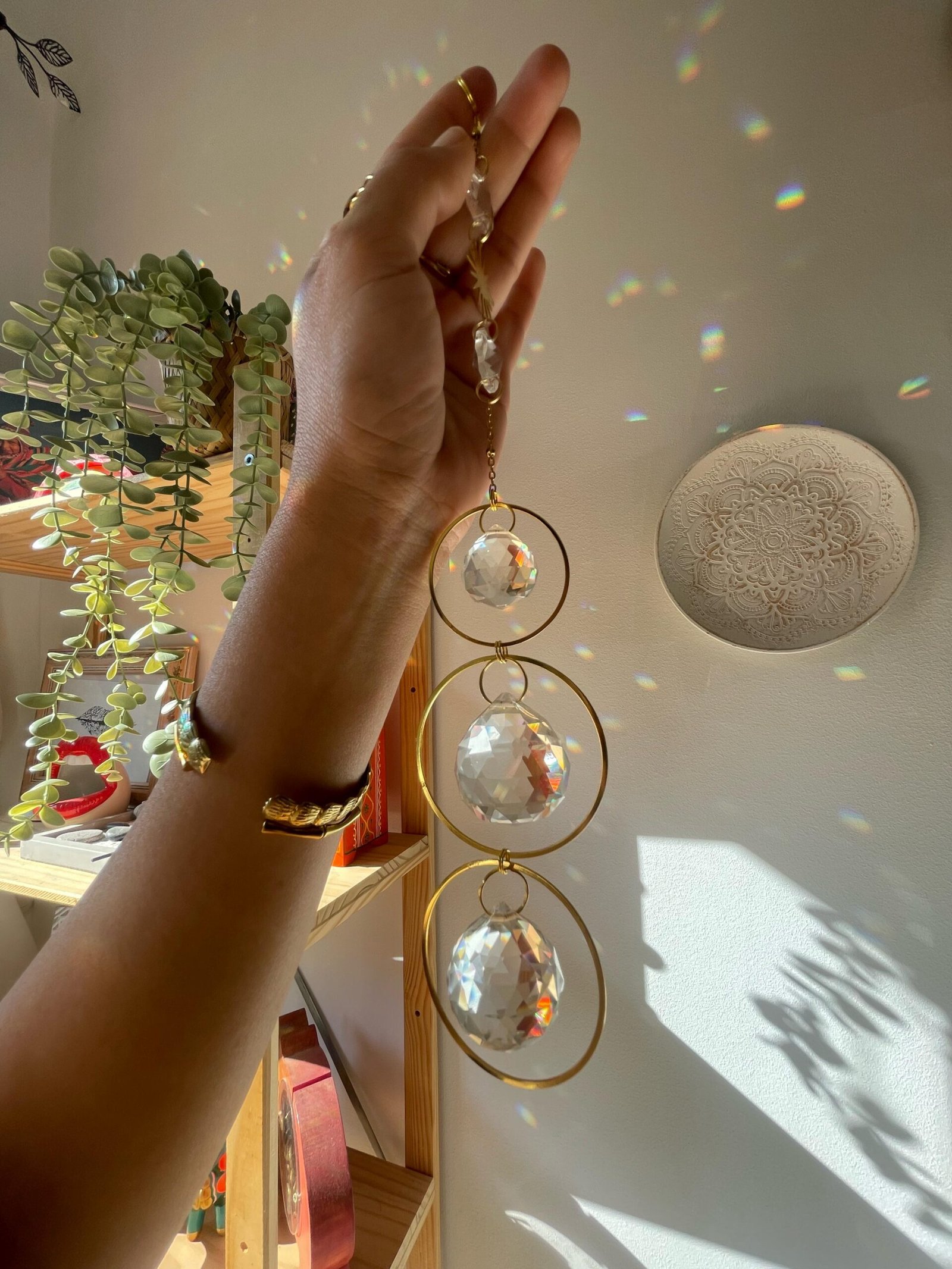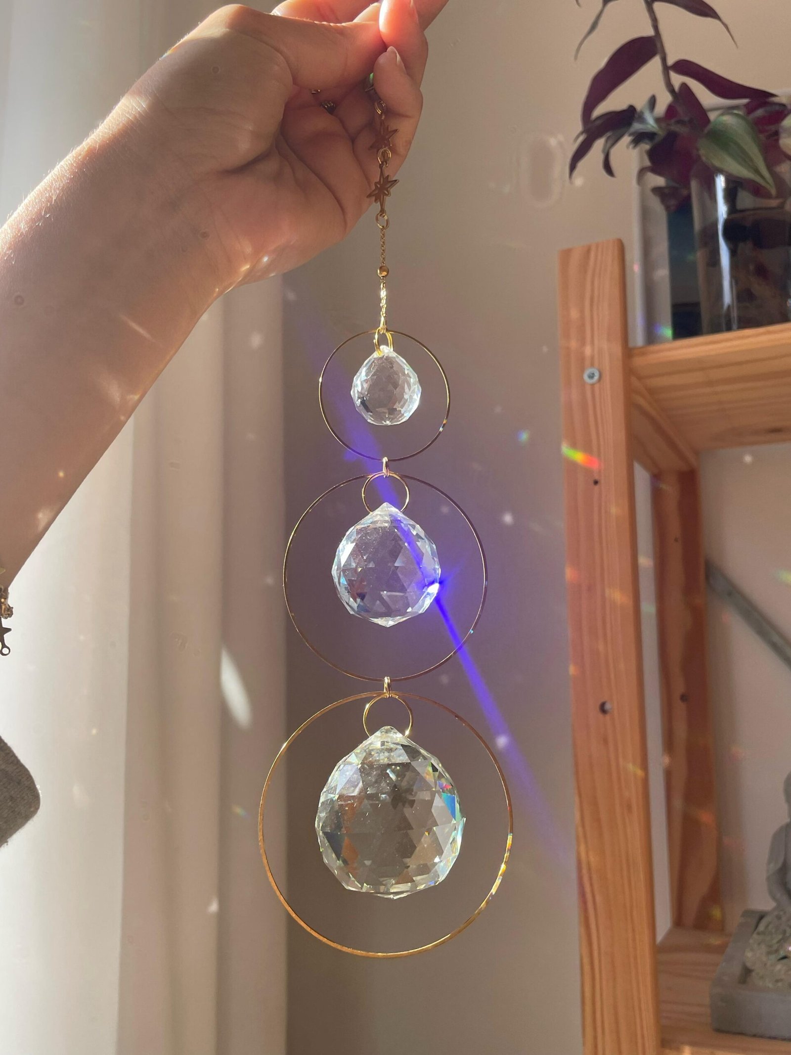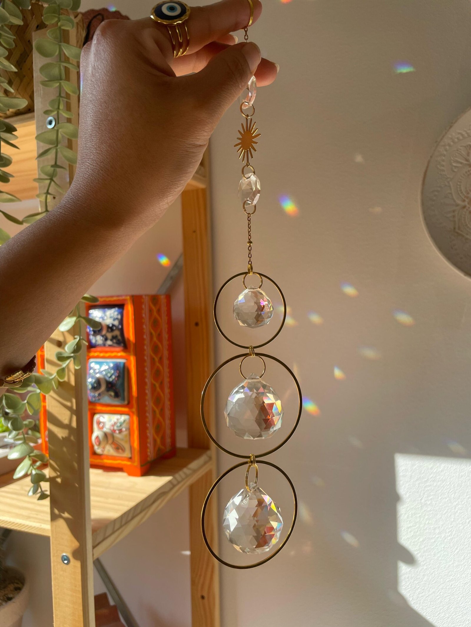 Luz, movimiento y brillo en una sola pieza. Este suncatcher está formado por tres circunferencias doradas de acero inoxidable que enmarcan tres cristales facetados: dos de 4 cm y uno de 1 cm. Cada rayo de sol que lo toca se transforma en un juego de destellos y arcoíris que llenan de magia cualquier rincón.